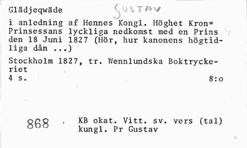 //// Glädjeqwäde T AV //// i anledning af Hennes Kongl. Höghet Kron= Prinsessans lyckliga nedkorast med en Prins den 18 Juni 182 7 (Hör, hur kanonens högtidliga dån ...) //// Stockholm 1827, tr. Wennlundska Boktryckeriet //// 4 s. 8:o //// or»Q . KB okat. Vitt. sv. vers (tal) //// ÖDO kungl. Pr Gustav ////