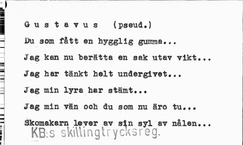 //// J //// | Gustavus (pseud.) a Du som fått en hygglig gumma... //// Jag kan nu berätta en sak utav vikt... //// ¦ Jag har tänkt helt undergivet... i Jag min lyra har stämt... //// Jag min vän och du som nu äro tu... //// ¦ Skomakarn lever av s^n syl av nålen... //// | KB:S skiUinglrycksreg. ////