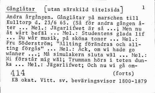 //// Gånglåtar [utan särskild titelsida^ 1 //// Andra årgången. Gånglåtar på marschen till Kulltorp d. 23/6 65. (Så för andra gången å-ter ... Mel.: Jägarlifwet är så ...; Men nu åt vårt befäl ... Mel.: Studentens glada lif ... Du wår musik, på sköna toner ... Mel.: Fru Söderström; "Allting förändras och allting förgås" ... Mel.: Ack, om wi hade go wänner ...; Må simulakern sluta wäl ... Mel.: Ni förstår mig wäl; Trumman hörs i teten dunka ... Mel.: Jägarlifwet; Och nu wi gå om- //// 414 (forts) //// KB okat. Vitt. sv. beväringsvisor 1800-1879 ////
