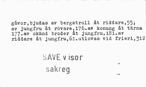 //// gåvor,bjudas av bergstroll åt riddare,55; av jungfru åt rövare,176.av konung åt tärna 177.av okänd broder åt jungfru,l8l.av riddare åt jungfru,6l.utlovas vid frieri,J>12 //// SAVE v isor //// sakreg ////