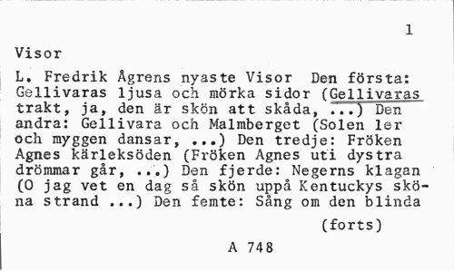 //// 1 //// Visor //// L. Fredrik Ågrens nyaste Visor Den första: Gellivaras ljusa och mörka sidor (Gellivaras trakt, ja, den är skön att skåda, ...) Den andra: Gellivara och Malmberget (Solen ler och myggen dansar, ...) Den tredje: Fröken Agnes kärleksöden (Fröken Agnes uti dystra drömmar går, ...) Den fjerde: Negerns klagan (0 jag vet en dag så skön uppå Kentuckys sköna strand ...) Den femte: Säng om den blinda //// (forts) //// A 748 ////