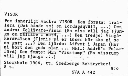 //// VISOR //// Fem innerligt vackra VISOR Den första: Tral-lera (Det hände sej en lördagsqväll, ...) Den andra: Gellivare-Visan (En visa vill jag sjunga om rålläte I nord, ...) Den tredje: Vingåkersvalsen (Tjenis pa er töser här ska ni se en gutt *..) Den fjärde: Lifvet i Japan (Har ni hört den goda plan ... Mel.: André"s Polarfärd) Den femte: Min "Visstump" (En visstump vill jag sjunga ...) - - - . -- //// Stockholm 1906, tr. Smedbergs Boktryckeri 8 s. 8:0 //// SVA A 442 ////