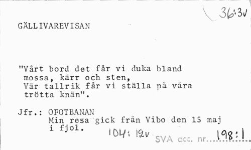 //// GÄLLIVAREVISAN //// "Vårt bord det får vi duka bland mossa, kärr och sten, Vär tallrik får vi ställa på våra trötta knän". //// Jfr.: 0FOTBANAN //// Min resa gick från Vibo den 15 mal //// ' rJ01' W SVA E1 n,.ÄL ////