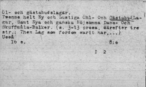 //// Gl- och gästabudslagär. //// Tvenne helt Ny och Lustiga Öhl- Och Oäatab^La-gar, Samt Nya och ganska Nöj samma Dana-Och Skuffmåla-Balker. (s. 3*13 prosa, därefter tre str.; Then Lag som fordom warit har,...) U«©& //// Ib 8, 8.:o //// I 2 ////