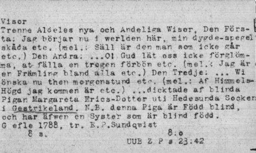 //// Visor //// Trenne Aldeles nya och Andeli^a Wisor, Den Första; Jag börjar nu 1 werlcen här, min dygde-spegel skåda etc. (mel.; Säll är den mar, som icke £?år etc,) Den Andra; ...01 Gud lät oss icke förglömma, at- fälla en trogen förben etc. (mel.-; Jag är er Främlinp- bland alla e>tc.) Den Tredje; ... Wi önska nu then morgonstund etc» (mel,i Af Hlmne!»-Högd jag kommen är etc.) ... dioktade af blitxia Pigan Margareta Erics-Dot*er uti Hedesunda Sockei i Gs_atrikeland . I".B. denna Piga ar Född blind, och har af ven en Syster som är blind född. G ef le 1788, tr. E. P.Sundqwi «t //// 8 s. 8.o //// UUB Z P 3 23; 4-2 ////