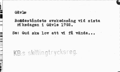 //// j Gävle //// - BoMeståndets avskedssång vid sista riksdagen i Gävle 1792. //// j Se: Gud ske lov att vi få vända... //// i KB:s skillingtrycksreg. //// i i ////