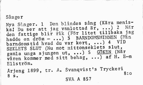 //// Sånger //// Nya Sånger. 1 Den blindes sång (Kära menis-kaj Du ser att jag vanlottad är, ...) 2 När den fattige blir rik (För litet tillbaka jag hadde en dröm - ...) 3 BARNDOMSMINNEN (Min barndomstid hvad du var kort, ...) 4 VID SEKLETS SLUT (Nu mot nittonseklets slut, gamla unga sjungen ut, ...) 5 GÖKEN (När våren kommer med sitt behag, ...) af H. E-m Ellström. //// Arjeng 1899, tr. A. Svanqvist's Tryckeri 8 s. 8:o //// SVA A 857 ////