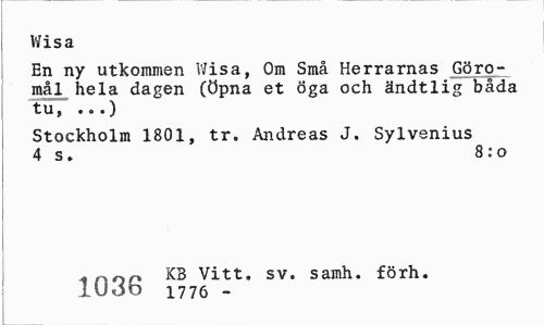 //// Wisa //// En ny utkommen Wisa, Om Små Herrarnas Göro-mål hela dagen (Öpna et öga och ändtlig båda tu, ...) //// Stockholm 1801, tr. Andreas J. Sylvenius 4 s. 8:0 //// * n nn KB Vitt, sv. samh. förh. lUtib 1776 - ////