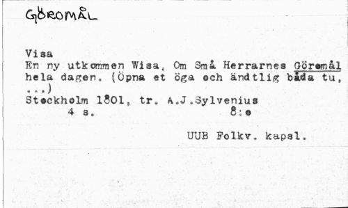 //// Visa //// En ny utkommen Wisa, Om Små Herrarnes Göremål //// hela dagen. (Öpna et öga och ändtlig bada tu, //// « * • ) //// Stockholm 1801, tre k.J.Sylvenius 4 3. 8:0 //// UUB Folkv. kapsl. ////