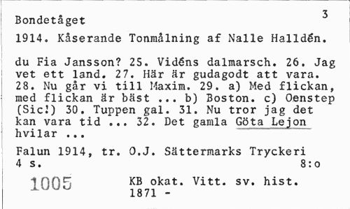 //// 3 //// Bondetåget //// 1914, Kåserande Tonmålning af Nalle Halidén. //// du Fia Jansson? 25. Vidéns dalmarsch. 26. Jag vet ett land. 2 7. Här är gudagodt att vara. 28. Nu går vi till Maxim. 29. a) Med flickan, med flickan är bäst ... b) Boston, c) Oenstep (SicJ) 30, Tuppen gal. 31. Nu tror jag det kan vara tid ... 32. Det gamla Göta Lejon hvilar ... //// Falun 1914, tr. O.J. Sättermarks Tryckeri 4 s. 8: o //// inn^l KB Okat. Vitt. sv. hist. //// xuuo 18?1 _ ////