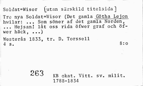 //// Soldat=Wisor [utan särskild titelsida] //// Tre nya Soldat=Wisor (Det gamla Götha Lejon hwilar: ... Som söner af det gamla Norden, ... Hejsan! låt oss rida öfwer graf och öf-wer häck, ...) //// Westerås 1833, tr. D. Torssell 4 s. 8:0 //// KB okat. Vitt. sv. milit. 1788-1834 ////