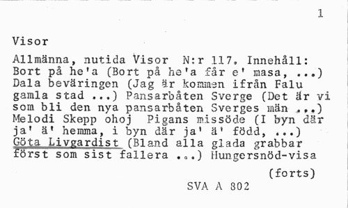 //// 1 //// Visor //// Allmänna, nutida Visor N;r 117, Innehåll: Bort på he'a (Bort på he'a får e' masa, ...) Dala beväringen (Jag är kommen ifrån Falu gamla stad ...) Pansarbåten Sverge (Det är vi som bli den nya pansarbåten Sverges män ,».) Melodi Skepp ohoj Pigans missöde (I byn där ja' ä1 hemma, i byn där ja1 ä' född, ...) Göta Livgardist (Bland alla glada grabbar först som sist fallera .„.) Hungersnöd-visa //// (forts) //// SVA A 30 2 ////