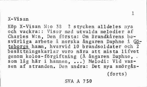 //// 1 //// X-Visan //// Köp X-Visan N:o 33 2 stycken alldeles nya och vackra:: Visor med utvalda melodier af Charles W:n, Den första: Om Brandkårens besvärliga arbete å norska ångaren Daphne i Göteborgs hamn, hvarvid 10 brandsoldater och 2 besättningskarlar voro nära att mista lifvet genom kolos-förgiftning (Å ångaren Daphne, . som låg här i hamnen, ...) Melodi: Vid vassen af stranden. Den andra: Det nya smörgås- //// (forts) //// SVA A 7 50 ////