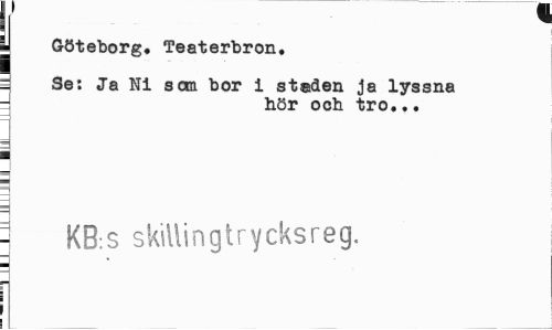 //// \{ 1 //// j //// i Göteborg. Teaterbron. //// i Se: Ja Ni som bor i st®den ja lyssna i hör och tro... //// i //// - KB.s skillingtrycksreg. //// i ////