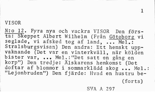 //// 1 //// VISOR //// N:o 12. Fyra nya och vackra VISOR Den förs-ta: Skeppet Albert Wilhelm (Från Göteborg vi seglade, vi afsked tog af land, ... Mel.: Stralsburgsvisan) Den andra: Ett hemskt uppvaknande (Det var en vinterkväll, när kölden bister var, ... Mel,:"Det satt en gång en korp") Den tredje: Älskarens hemkomst (Det doftar af blommor i sommarklädd skog ... Mel.: "Lejonbruden") Den fjärde: Hvad en hustru be- //// (forts) //// SVA A 297 ////