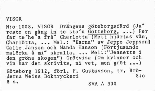 //// VISOR //// N:o 1008. VISOR Drängens göteborgsfärd (Ja^ reste en gång in te sta'n Götteborg;, ...) Per far te"he"a frå' Charlotta (Mett hjärtas vän, Charlotta, ... Mel.: "Karna" av Jeppe Jeppson) Calle Janson och Manda Hanson (Förtjusande malörka å mi"' skralla, ... Mel.: "Jeanette i den gröna skogen") Grötvisa (Om kvinnor och vin har det skrivits, ni vet, men gröt ...) //// Göteborg 1912, förl. F. Gustavson, tr. Bröderna Weiss Boktryckeri 8:0 //// 8 s# SVA A 300 ////