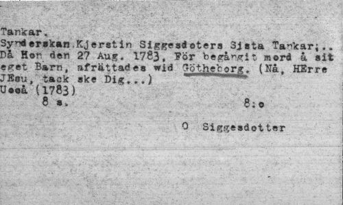 //// rankar, //// 3ynder»kan Kjerstin Siggesdoters Sista Tankar j.. Då Hor den 27 Åug. 1783, För begå^git mord å sit ege t Barn, af rättades wid SSthefcory. (Nå, HBrre JEsu, tack ske Dig...) Uooå (1783) //// 8 s. 8;o //// 0 Siggesdotter ////