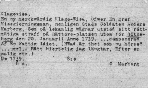 //// Klagovisa, //// En ny merekwärdig Klago-Wisa, Ofwer En grof Missgierningsman, nemligen Stads Soldaten Anders härberg, Som på lekamlig wägnar utstod sitt rättmätiga straff på Rät t are-olat zen utom för '}c t he -borg den 20. Januari! Anno 1739. ». .camponerat" ATKn Fattig Idiot. (HWad är thet som nu höres? ... mel.; Rätt hiertelig jag längtar, Efter en salig etc.) //// Uo 1739. 8:o //// 0 s. O Marbsrg ////