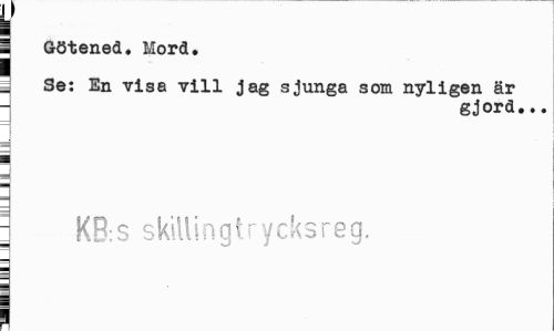//// 1 //// ! Götened. Mord. //// l Se: En visa vill jag sjunga som nyligen är //// gjord... //// ; KB:S skillingtrycksreg. ¦ ////