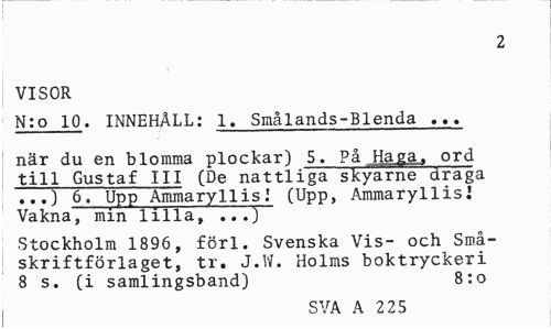 //// 2 //// VISOR //// N:o 10. INNEHÅLL: 1. Smålands-Blenda ... //// när du en blomma plockar) 5. På Haga, ord till Gustaf III (De nattliga skyarne draga ...) 6. Upp Ammary 11 is(Upp, Ammaryllisi Vakna, min lilla, ...) //// Stockholm 1896, förl. Svenska Vis- och Små-skriftförlaget, tr. J.W. Holms boktryckeri 8 s. (i samlingsband) 8:o //// SVA A 2 25 ////