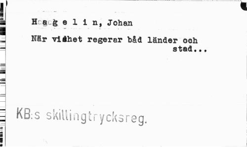 //// r * //// j //// | H a g e 1 i 11, Johan //// = Kär viåhet regerar båd länder och g stad.., //// ] KB:S skillingtrycksreg, //// i I ////