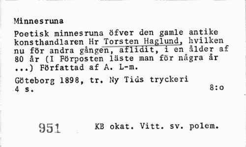 //// Minnesruna //// Poetisk minnesruna öfver den gamle antike konsthandlaren Hr Torsten Haglund, hvilken nu för andra gången, aflidit, i en ålder af 80 år (I Förposten läste man för några år ...) Författad af A. L-m. //// Göteborg 1898, tr. Ny Tids tryckeri 4 s. 8:o //// 951 KB okat. Vitt. sv. polem. ////