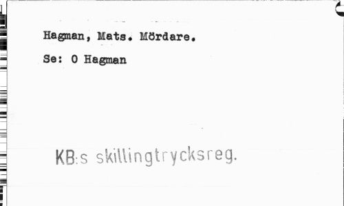//// I - - . //// [ Hagman, Mats. Mördare. //// ¦ Se: O Hagman //// : KB.s skillingtrycksreg. //// i ////