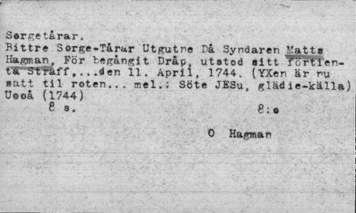 //// Sorgetårar. //// Bittre Sorge-Tårar Utgutne Då Syndaren Matt» Hagman, För 'fcegångit Dråp, utstod »itt forTfen-t"S Straff, .. .den 11. April, 1744. (YXen är nu »att til roten... mel.; Söte JESu, gläd ie-källa) Uooå (1744) //// 8s. 8;• //// 0 Hagman ////