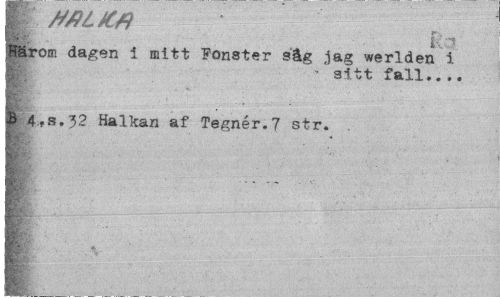 //// 1 MLJCfl //// Härom dagen i mitt Fönster såg jag werlden i |f * sitt fall... //// B 4,8.32 Halkan af Tegnér.7 str. ////