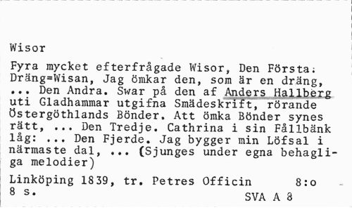 //// Wisor //// Fyra mycket efterfrågade Wisor, Den Första; Dräng=Wisan, Jag ömkar den, som är en dräng, ... Den Andra. Swar på den af Anders, Hallberg uti Gladhammar utgifna Smädeskrift, rörande Östergöthlands Bönder. Att ömka Bönder synes rätt, ... Den Tredje. Cathrina i sin Fållbänk låg: ... Den Fjerde. Jag bygger min Löfsal i närmaste dal, ... (Sjunges under egna behagliga melodier) //// Linköping 18 39, tr. Petres Officin 8:0 //// 8 s* SVA A 8 ////