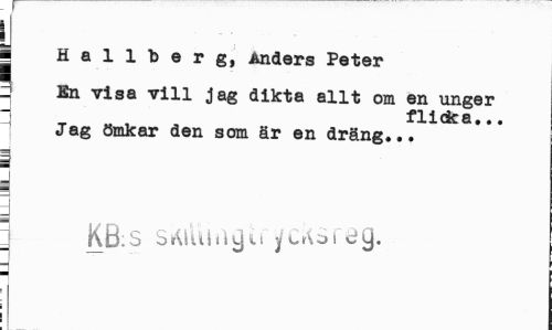 //// J //// I //// I //// ¦ Hallberg, Anders Peter i //// En visa vill jag dikta allt om en unger //// flicka... Jag ömkar den som är en dräng... //// J //// ¦ //// 1 KB:s s^tUhigu yc^sreg. //// i //// i ////