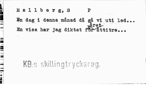//// |j Hallberg, S P //// I En dag i denna månad då gå vi uti led... j ^året- //// En visa har jag diktat f§i^attitre... //// | //// 1 //// 3 KB.s skillingtrycksreg. //// [i //// =¦ ! ¦ //// II ___- ////