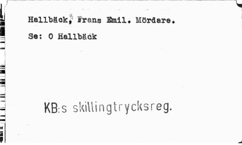 //// \ Hallbäck, Irans Smil. Mördare. //// ! Se: O Hallbäck //// j //// J //// i //// i //// 3 KB:S skillingtrycksreg. //// i i ////