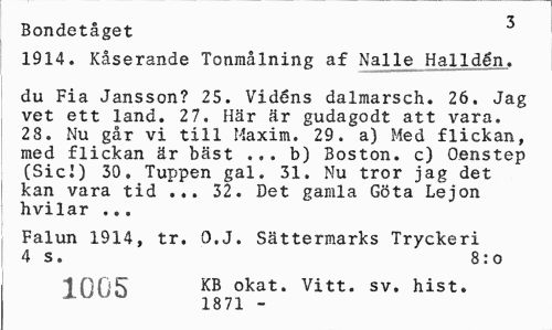 //// 3 //// Bondetaget //// 1914. Kåserande Tonmålning af Nalle Halidén. //// du Fia Jansson? 25. Vidéns dalmarsch. 26. Jag vet ett land. 27. Här är gudagodt att vara. 28. Nu går vi till Maxim. 29. a) Med flickan, med flickan är bäst ... b) Boston, c) Oenstep (SicJ) 30. Tuppen gal. 31. Nu tror jag det kan vara tid ... 32. Det gamla Göta Lejon hvilar ... //// Falun 1914, tr. O.J. Sättermarks Tryckeri 4 s. 8: o //// mns KB okat. Vitt. sv. hist. //// ° 1871 - ////
