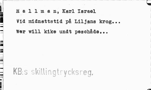 //// I ^ //// L //// y Hallman, Karl Israel //// I Vid midnattstid på Liljans krog... ^ Wer will kike undt peschåde... //// i //// : KB:S skillingtrycksreg. //// i i I ////