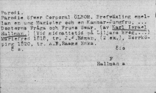 //// Parod i , //// Parodis cfw«r Corporal ÖLEOM, Erefwäxling emellan en ung Magister och en Kammar-Iu^fru, ... Doctorns Fråga ooh Frans 3war. (av Karl lava»! Hal Inan .) (Wid midnattstid på Liljans krsg, . ..) IHSlv i efre d 1818, tr. J,-*.Edman, (2 ex.), Norrköping 1*20, tr. A.J.Ra»irs Enka. //// 5 s. £:o //// F //// Hallman » ////