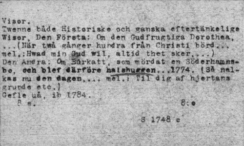 //// Vi»or. //// Twenne både Historiske och ganska eftertänkslige Wisor, Den Första: Qn den Oudfrugtiga Dorothea, ..(Här ti»å gånger hundra från Chri et i bord.., ¦nel.:Hwad min ..gpdl wil, »Itid thet sker,..,) Den Andra: Mrkatt, a era mördat en 3Öd erhaans-be, oeh blef «&rfér» ksil*bu***n.. .1774. (3S kas nu <len dagen,.. , h^ITj fil' dig af hjertans grunde etc.} Gefle uå, ib 1784. //// P . 8:« //// S 1748 V ////