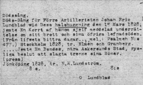 //// J» //// Dödssång, //// Döds-Sång för Förre Artilleristen Johan Frie Lundblad wid Dess halshuggning den l* Mars 1828; jemte En Korrt af honom" sJeTT -neddelad underrättelse om sitt "brott och sina öfriga lefnadsöden, (Från lifwets bittra dagar.,, mel,: Psalmeh N: • 477.) Stockholm 1828, tr. Elmén och Granberg. . .»k ..T em te En Bondes, nära Askersunds Stad, rysliga beslut att slagta trenne sina Söner, (prosa) //// Jönköping 1Ö28, tr. N.E.Lundström, //// 8 s. 8;o //// 0 Lundblad ////