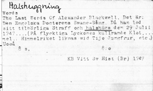 //// tiois loXvuD» //// Word s 6 ' * //// The; Last ?'crds Cf Alexander Blackwell. Det är; Den EngelsKa Bon t orens 3wane-S§ng Bå han led sitt tiinörliga Straff och halshöra de" 29 Jul i i 1747...(PÅ flycktiga Lyckonea kullrande Klot,.. kel.. Himmelriket liknas wi d Tijo Jungfrur, etc.) . Uooa //// B s. _ ? - o //// KB Vitt 3v Hist (Br) 174? //// s ! ////