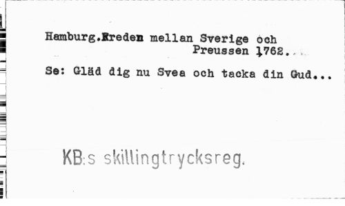 //// « Hamburg.Kreden mellan Sverige och //// I Preussen 1762.„, //// 4 //// - Se: Gläd dig nu Svea och tacka din Gud... //// i //// j //// É //// II //// 3 //// J KB:s skillingtrycksreg. ¦ //// i I ___ //// ¦ 'i ////