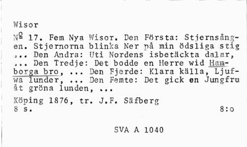 //// Wisor //// 17. Fem Nya Wisor. Den Första: Stjernsång-en. Stjernorna blinka Ner på min ödsliga stig //// Den Andra: Uti Nordens isbetäckta dalar, ... Den Tredje: Det bodde en Herre wid Ham-borga bro, ... Den Fjerde: Klara källa, Ljuf-wa 1under, ... Den Femte: Det gick en Jungfru åt gröna lunden, ... //// Köping 18 76 , tr. J.F. Säfberg 8 s. 8: o //// SVA A 1040 ////