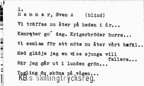 //// I 1. //// j Hammar, Sven A (blind) //// = Ti träffas nu åter på heden i år... //// Kamrater go' dag. Krigarbröder hurra... //// i Vi samlas för att möta nu åter vårt befäl.. //// | Med glädje jag en -wisa sjunga vill a fallera... //// _ När jag går ut i lunden grön... //// Yngling du sköna på vågen... //// KSs skillingtrycksreg. ////