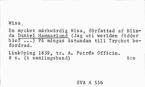 //// Wisa, //// En mycket märkwärdig Wisa, författad af Blinda Daniel Hammarlund (Jag uti werlden födder biet ...J Pä mångas åstundan till Trycket befordrad. //// Linköping 1839, tr. A. Petrés Officin. 8 s. (i samlingsband) 8:0 //// SVA A 556 ////