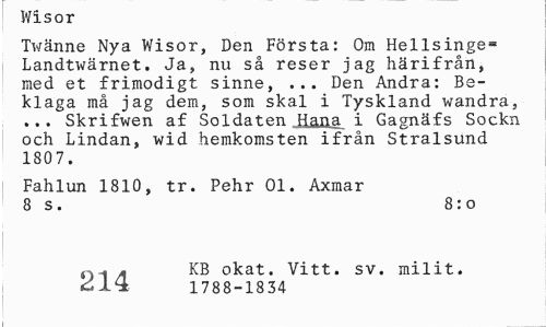 //// Wisor //// Twänne Nya Wisor, Den Första: Om Hellsinge* Landtwärnet. Ja, nu så reser jag härifrån, med et frimodigt sinne, ... Den Andra: Beklaga må jag dem, som skal i Tyskland wandra, ... Skrifwen af Soldaten .Håna, i Gagnäfs Sockn och Lindan, wid hemkomsten ifrån Stralsund 1807. //// Fahlun 1810, tr. Pehr 01. Axmar 8 s. 8:o //// 4 , m KB okat. Vitt. sv. milit. //// 1788-1834 ////