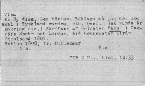//// Vi sa //// Er: Ny Wisa, Som börja»: Beklaga må jag de**» som skal i Tyskland wandra, etc. (nel.: Sex runda år onkrinr etc.) Skrlfwen af Soldaten Ha na i Ga<*-rsäfs Sockn och Lindan, wid hesnkornaten 'irran Stralsund 1807. Fahlun l£o8, tr. P.O.Axmar //// 4 a, 8;o //// UUB Z Utv, hist. 12:33 ////