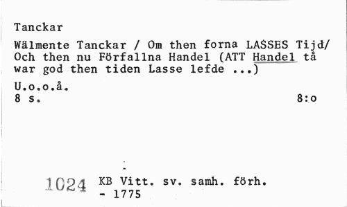 //// Tanckar //// Wälmente Tanckar / Om then forna LASSES Tijd/ Och then nu Förfallna Handel (ATT Handel tå war god then tiden Lasse lefde ..,) //// U.o.o.å. //// 8 s. 8:0 //// 1094 KB Vitt. sv. samh. förh. //// VJ(C± - 1775 ////