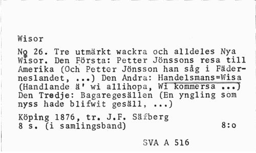 //// Wisor //// Nq 26. Tre utmärkt wackra och alldeles Nya Wisor. Den Första: Petter Jönssons resa till Amerika (Och Petter Jönsson han såg i Fäderneslandet, ...) Den Andra: Handelsmans=Wisa (Handlande ä' wi allihopa, Wi kommersa 777} Den Tredje: Bagaregesällen (En yngling som nyss hade blifwit gesäll» ...) //// Köping 1876, tr. J.F. Säfberg 8 s. (i samlingsband) 8:o //// SVA A 516 ////