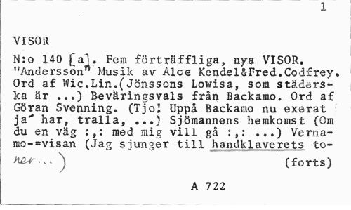 //// VISOR //// N:o 140 [al. Fem förträffliga, nya VISOR. "Andersson" Musik av Alce Kendel&Fred.Codfrey. Ord af Wic.Lin.(Jönssons Lowisa, som städerska är ...) Beväringsvals från Backamo. Ord af Göran Svenning. (Tjol Uppå Backamo nu exerat ja" har, tralla, ...) Sjömannens hemkomst (Om du en väg :,: med mig vill gå :,: ...) Verna-mo-=visan (Jag sjunger till handklaverets to- //// ) (forts) //// A 722 ////