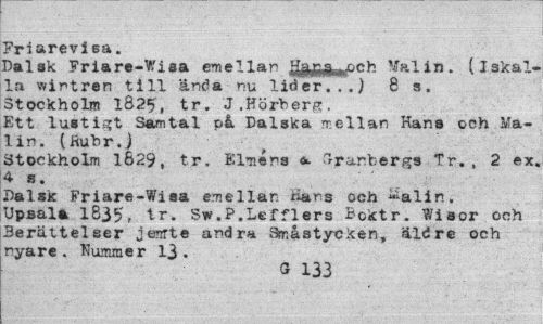//// Friarevisa. //// Dalak Friare-Wiaa emellan Hghffif--- r.rh Malin, (iskalla wirtren till ända nu lider...) 8 s. Stockholm 1S25, tr. J.Hörberg. //// Ett lustigt Samtal på Dalska mellan Hans och Malin. (Hubr.j //// Stockholm 1629, tr. JSlméns ^ Granbergs Tr. , 2 ex. 4 s. //// Dalsk Friare-Wisa emellan Hans och ^alin. Upsala 1835, tr. Sw. P.Lef fl ers Bcktr. Wisor och 3erättelser jairte andra Småstycken, äldre och nyare. Nummer 13. //// 0 133 ////