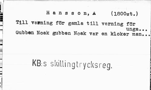 //// • .. . //// I Hansson,a (l800=t.) //// 1 Till varning för gamla till varning för ' unga... //// Gubben Noak gubben Noak var en kloker man,.. //// I KB:s skillingtrycksreg. //// i ////